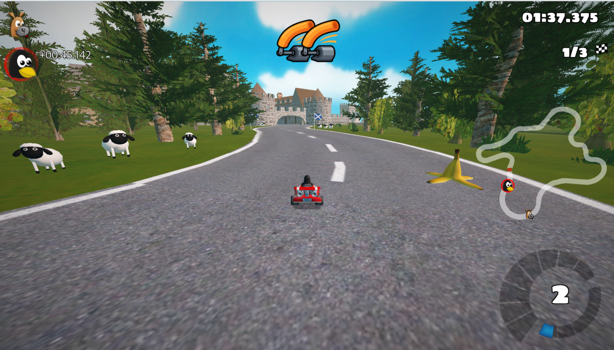 Two players, each in their own cart, play a local race of SuperTuxKart. When you collect an in-game item, instead of a koopa hitting the opponent on-screen, they get one of several physical effects at their seat: A fog burst hiding their vision, a water squirt making them flinch, or a harmless Poolnudelschlagapparat-thwack.
